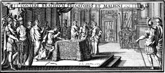 Description: This historiated headpiece depicts a ruler surrounded by soldiers writing a law with the Latin phrase CONTERE BRACHIUM PECCATORIS ET MALIGNI from Psalm 10:15 which means “break the arm of the wicked and the evildoer”.