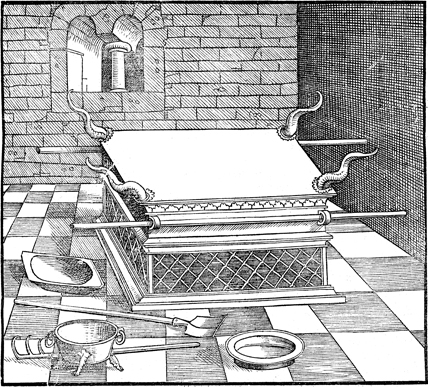 Description: This print features the altar of sacrifice with horns and poles for carrying as described in Exodus. There is a basin and implements for the sacrifice. This and other woodcuts in this 1533 Bible are the work of the German artist, Erhard Altdorfer (d. 1561).