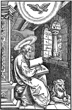 Description: The Gospel writer Mark with a pen writing his gospel. A lion, his attribute, is at his feet. This and other woodcuts in this 1533 Bible are the work of the German artist, Erhard Altdorfer (d. 1561).