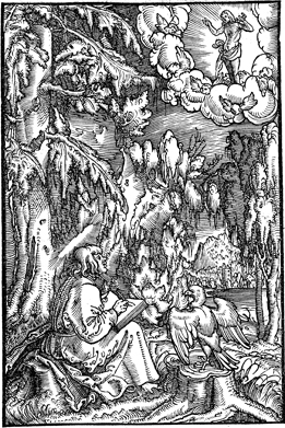 Description: John sits in the forest writing his Gospel. The risen Christ is in the heavens. This and other woodcuts in this 1533 Bible are the work of the German artist, Erhard Altdorfer (d. 1561).