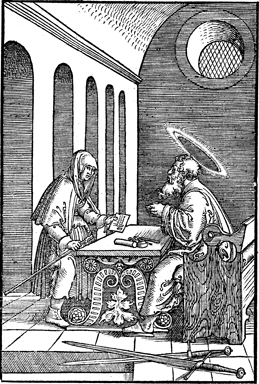 Description: Paul gives a letter to the messenger Phoebe. This and other woodcuts in this 1533 Bible are the work of the German artist, Erhard Altdorfer (d. 1561).