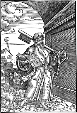 Description: The apostle Peter holds the keys to the Kingdom of Heaven, his attribute. This and other woodcuts in this 1533 Bible are the work of the German artist, Erhard Altdorfer (d. 1561).