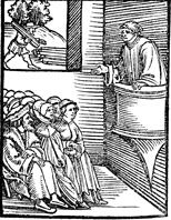 Description: This image depicts a violation of the third commandment: ““Honor the Sabbath, to keep it holy.” “ As the congregation is gathered for worship and instruction on Sunday, outside an individual does work.