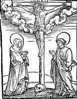 Description: Christ hangs on the cross as Mary and John stand nearby. A skull and a bone sit in front of the cross.