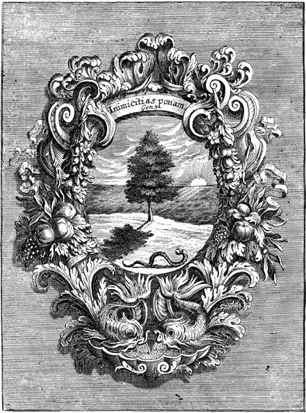 Description: This emblem depicts the serpent holding the forbidden fruit in its mouth near a tree in the center of the Garden of Eden. Written across the title banner is the Latin phrase INIMICITIAS PONAM which translates to "enmity," referring to the text of Genesis 3:15, “And I will put enmity between you and the woman, and between your offspring and hers he will crush your head, and you will strike his heel.” This emblem is one in a series of 46 published by Cardinal Celestino Sfondrati confirming the Immaculate Conception in nature.