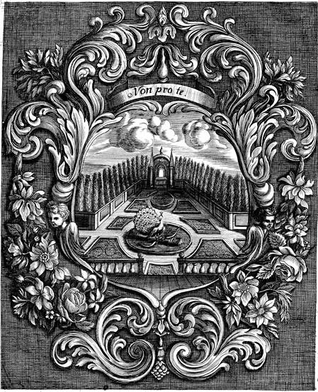Description: This emblem depicts a peacock standing atop a bow and quiver in the center of a courtyard. The Latin phrase NON PRO TE, which translates "not only for you" titles the ornamental frame. This emblem is one in a series of 46 published by Cardinal Celestino Sfondrati confirming the Immaculate Conception in nature.