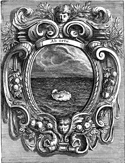 Description: This emblem depicts a pearl cradled by a sea shell floating across the water. The Latin phrase AB ORTU, which translates "from birth," titles the ornamental frame. This emblem is one in a series of 46 published by Cardinal Celestino Sfondrati confirming the Immaculate Conception in nature.