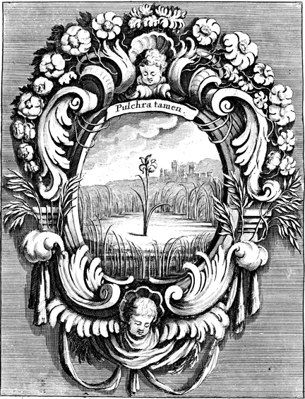 Description: This emblem depicts a single flower in a field of grass with a distant city rising in the background. The Latin phrase PULCHRA TAMEN, which translates "still [or] yet beautiful" titles the frame. This emblem is one in a series of 46 published by Cardinal Celestino Sfondrati confirming the Immaculate Conception in nature.