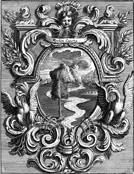 Description: This emblem depicts a landscape featuring a palm tree growing by a winding stream. The ornamental frame is flanked by two cranes and is titled with the Latin motto RADIX SANCTA, which translates "sacred root," referring to the Virgin Mary, who has been compared to the RADIX SANCTA since at least the twelfth century in the Marian liturgical hymn, Ave regina caelorum (‘Hail, Queen of Heaven’). This emblem is one in a series of 46 published by Cardinal Celestino Sfondrati confirming the Immaculate Conception in nature.