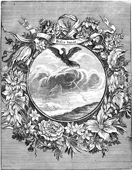 Description: This emblem depicts an eagle flying above a thunder cloud titled with the Latin motto INFRA TONAT, which translates "thunder beneath." This emblem is one in a series of 46 published by Cardinal Celestino Sfondrati confirming the Immaculate Conception in nature.