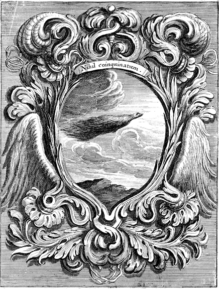 Description: This emblem depicts a bird soaring through the clouds titled with the Latin motto NIHIL COINQUINATUM, which translates "nothing stains." This emblem is one in a series of 46 published by Cardinal Celestino Sfondrati confirming the Immaculate Conception in nature.