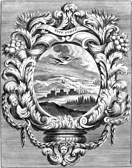 Description: This emblem depicts a heron flying through the sky over a city at the foothills of a mountain range. The Latin motto VERE VENIT, which translates "true coming," titles the ornamental frame. This emblem is one in a series of 46 published by Cardinal Celestino Sfondrati confirming the Immaculate Conception in nature.