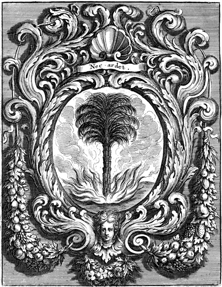Description: This emblem depicts a palm tree unscathed despite the fire at its base billowing smoke its trunk and leaves. The Latin phrase NEC ARDET, which translates" Yet Not Burnt" titles the ornamental frame. This emblem is one in a series of 46 published by Cardinal Celestino Sfondrati confirming the Immaculate Conception in nature.