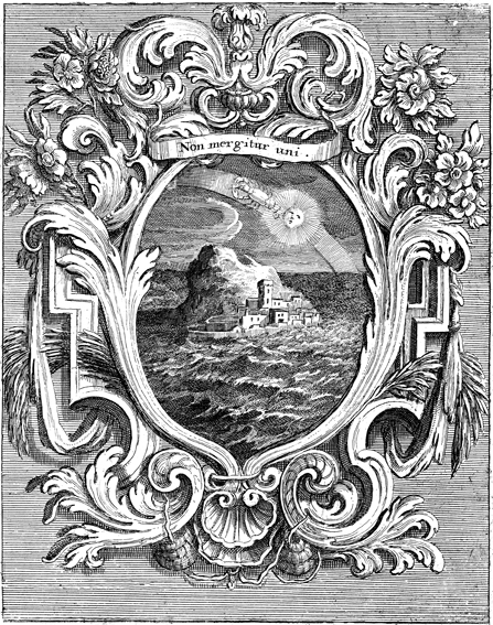 Description: This emblem depicts the zodiac Scorpio crossing the sun around the celestial sphere above a city rising from the rocks in the middle of the sea. The Latin motto NON MERGITUR UNI, which translates "Not One Sinks,” titles the ornamental frame. This emblem is one in a series of 46 published by Cardinal Celestino Sfondrati confirming the Immaculate Conception in nature.