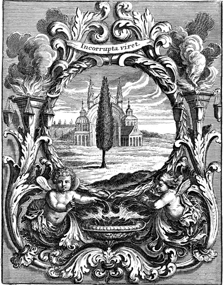 Description: This emblem depicts a tall poplar tree standing in front of a church. The Latin phrase INCORRUPTA VIRET, which translates to "untainted green," titles the ornamental frame flanked with two cherubs. This emblem is one in a series of 46 published by Cardinal Celestino Sfondrati confirming the Immaculate Conception in nature.