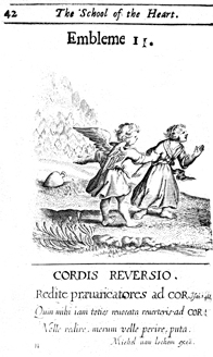 Description: This emblem depicts an angel urging a person to return to his or her heart which lies abandoned on the ground. The image is titled with the Latin CORDIS REVERSIO, which translates “the returning of the heart,” and is accompanied by the text of Isaiah 46:8. This is the eleventh in a series of 47 emblems published anonymously and adapted from Benedictine writer Benedict van Haeften's Schola Cordis (1629).