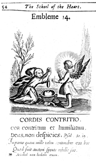 Description: This emblem depicts a man preparing to grind his heart with mortar and pestle while an angel gestures for him to cease. The image is titled with the Latin CORDIS CONTRITIO, which translates “the contrition of the heart,” and is accompanied by the text of Psalm 50:19. This is the fourteenth in a series of 47 emblems published anonymously and adapted from Benedictine writer Benedict van Haeften's Schola Cordis (1629).