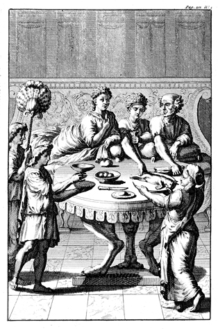 Description: This reproduction of a Roman dining scene from ancient monuments by antiquarian Pirro Ligorio (c. 1512/13-1583) features three diners reclining around a typical three-legged table, or tripod, while servants fan them and serve meat and wine.