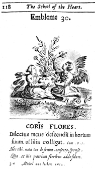 Description: This emblem depicts an angel arranging flowers in a woman’s heart, which acts as the vase. The image is titled with the Latin CORIS FLORES, which translates “the flowers of the heart,” and is accompanied by the text of Song of Songs 6:1. This is the thirtieth in a series of 47 emblems published anonymously and adapted from Benedictine writer Benedict van Haeften's Schola Cordis (1629).
