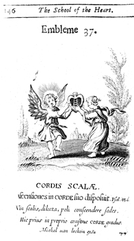 Description: This emblem depicts an angel and a woman grasping a heart which reveals a ladder inside of it. The image is titled with the Latin CORDIS SCALAE, which translates “the ladder of the heart,” and is accompanied by the text of Psalm 83:6. This is the thirty-seventh in a series of 47 emblems published anonymously and adapted from Benedictine writer Benedict van Haeften's Schola Cordis (1629).