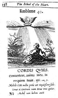 Description: This emblem depicts a woman kneeling on the ground and gazing up at an angel in heaven who holds her heart to his chest. The image is titled with the Latin CORDIS QUIES, which translates “the rest of the heart,” and is accompanied by the text of Psalm 114:7. This is the fortieth in a series of 47 emblems published anonymously and adapted from Benedictine writer Benedict van Haeften's Schola Cordis (1629).