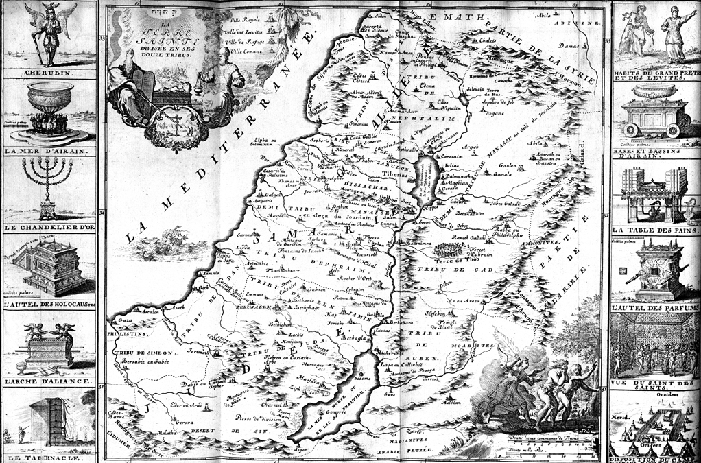 Description: A map of the Holy Land with various sacred objects (eg. the Tabernacle) depicted along the sides of the page.