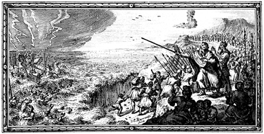 Description: Moses and Israel stand on the shore while Pharaoh’s army drowns.