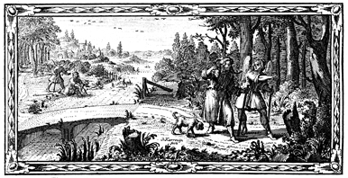 Description: Raphael heals Tobit in the foreground. In the background, Raphael talks with Tobias as the big fish approaches.