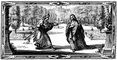 Description: Two lovers meet in the center of a garden. The artist and engraver, Jacobus Harrewijn (1660-1727), has placed his signature in the bottom right.