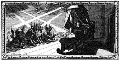 Description: Lying asleep, Daniel envisions the four winds blowing upon the sea, as four beasts climb ashore: one with the head of a lion and the wings of the eagle; a second, in the form of a bear, with three ribs in its mouth; the third, like a four-headed leopard with four wings; and the fourth, a mighty beast with long teeth, ten horns, and hooves like an ox’s. The engraver, Jacobus Harrewijn (1660-1727), has placed his signature in the bottom left.