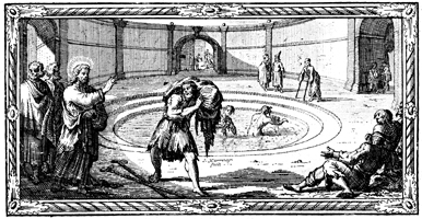 Description: In a synagogue of Galilee, Jesus heals a man who walked with crutches. The man promptly takes up a load and walks unassisted. Dutch engraver Jacobus Harrewijn (1660-1727) has placed his signature in the bottom center.