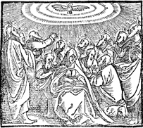 Description: The Holy Spirit descends upon the apostles and the Virgin Mary during the Pentecost.