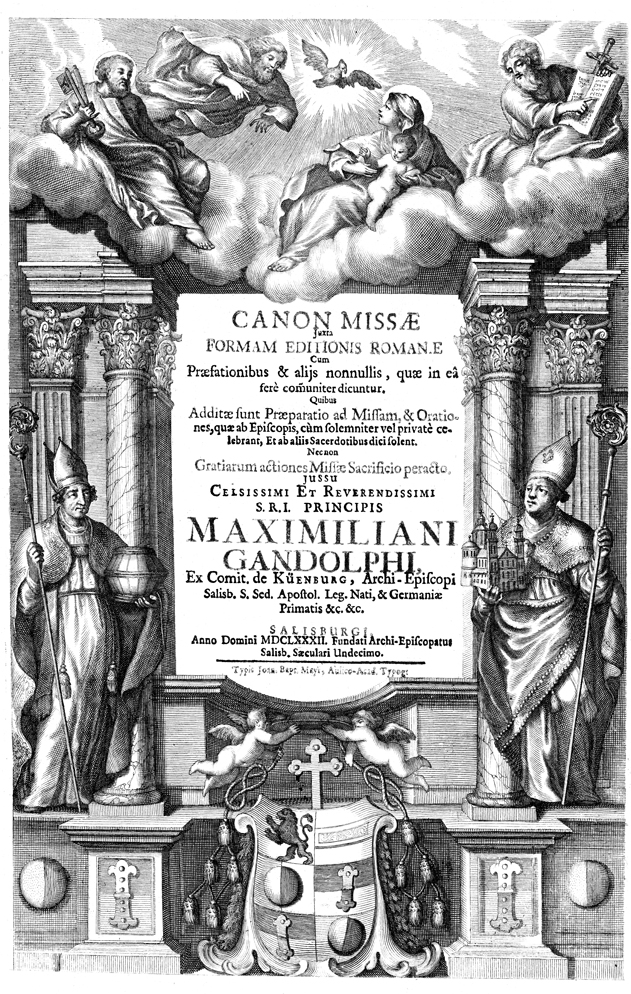 Description: This historiated title-page border depicts Father, Son, and Holy Spirit in the heavens with Mary holding the infant Jesus, flanked by Peter on the left (holding keys) and Paul on the right (holding a sword and Hebrew scriptures). Below them is a columned facade with bishops on either side and the coat of arms of Maximilian Cardinal Gandolph (author of the book) at the base.