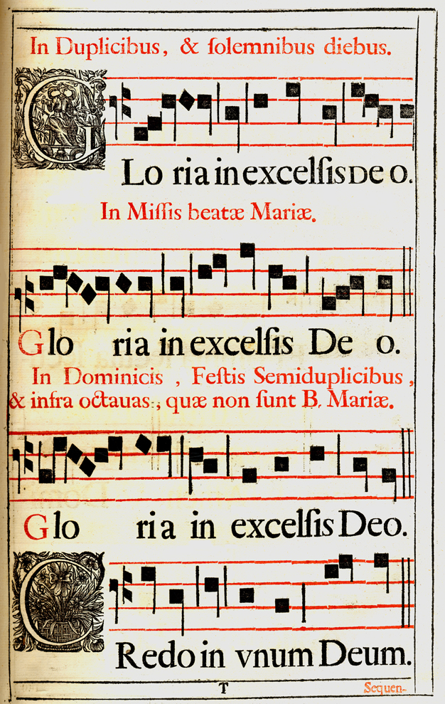 Description: A sheet of music featuring two initial letters, G and C. In the first, the personification of justice is pictured with her scales and sword, and in the second, a decorative flower.