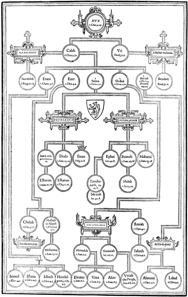 Description: The family tree of Hur, son of Caleb, son of Hezron, son of Perez, son of Judah, fourth tribe of Israel.