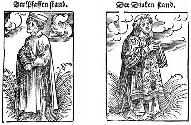 Description: Renderings of the priest and diafen stands. This woodcut was created by Lukas Cranach the Elder.