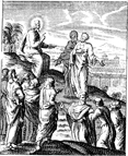 Description: Jesus teaches his disciples about the signs of the end starting with the fall of the temple, depicted in the background. Engraved by John Sturt (1658–1730).