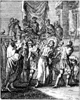 Description: Pilate washes his hands of guilt as Jesus is lead away to be crucified. Engraved by John Sturt (1658–1730).