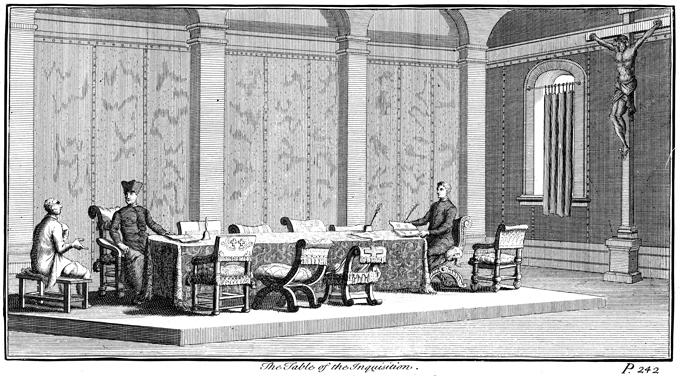 Description: The Spanish Inquisition, seated at a table, question a man.