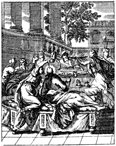 Description: A woman anoints Jesus' feet with perfume while he eats at the home of Simon the Leper in Bethany. Engraved by John Sturt (1658–1730).