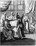 Description: John is circumcised, and his father Zechariah confirms that his name is to be John. Engraved by John Sturt (1658–1730).
