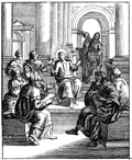 Description: Mary and Joseph find the twelve-year-old Jesus in the temple, sitting among the teachers, listening and asking questions. Engraved by John Sturt (1658–1730).