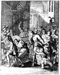 Description: Jesus tells the women not to weep for him as he carries his cross. Engraved by John Sturt (1658–1730).