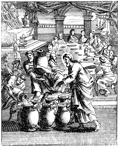 Description: Jesus changes water into wine at a wedding feast in Cana. Engraved by John Sturt (1658–1730).