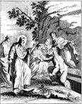 Description: As a crowd watches in amazement, Jesus raises Lazarus, now dead four days. Engraved by John Sturt (1658–1730).