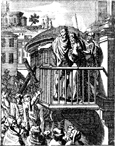 Description: Pontius Pilate asks the mob what he should do with Jesus; they cry out for his crucifixion, as represented by the cross. Engraved by John Sturt (1658–1730).