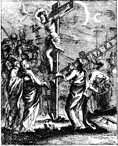 Description: Jesus hangs on the cross as Mary and the beloved look on. Engraved by John Sturt (1658–1730).