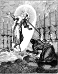 Description: John's vision of the one like a son of man among the seven golden lampstands. John is pictured at his feet. Engraved by John Sturt (1658–1730).