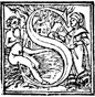 Description: An initial letter S with two people talking as a city, possibly Sodom, burns.
