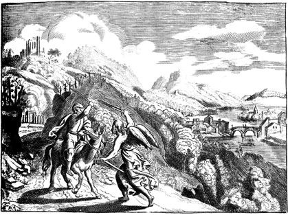 Description: Balaam beats his donkey for stopping as an angel stands in its way with sword raised.
